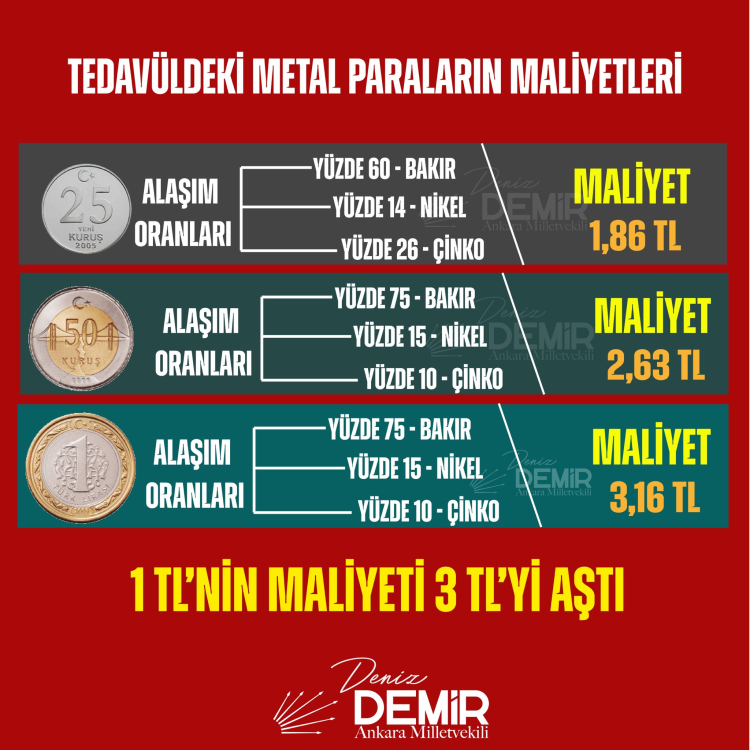 Ankara Milletvekili Deniz Demir, metal paralarda kullanılan alaşımlardaki artışa vurgu yaparak, madeni 1 TL’nin maliyetinin 3 TL’yi geçtiğini söyledi.