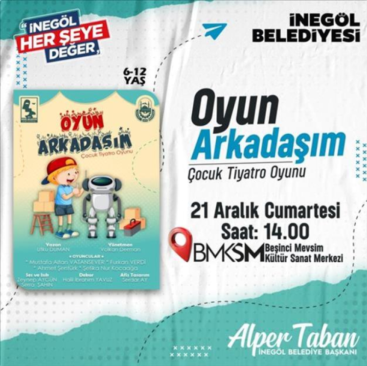 İnegöl Belediyesi çocukları da tiyatro gösterileriyle buluşturmaya devam ediyor. Her hafta Cumartesi günü 14.00’da Beşinci Mevsim Kültür Sanat Merkezinde yapılan çocuk tiyatro gösterileri kapsamında 21 Aralık Cumartesi günü “Oyun Arkadaşım” isimli gösteri İnegöllü miniklerle buluşacak.