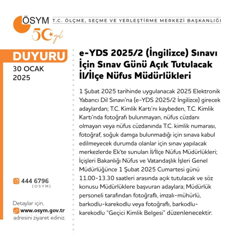 Kimlik kartı kaybeden veya kimlik kartında numara ve fotoğraf bulunmayan adaylar için il ve ilçe nüfus müdürlükleri, sınav günü açık olacak.