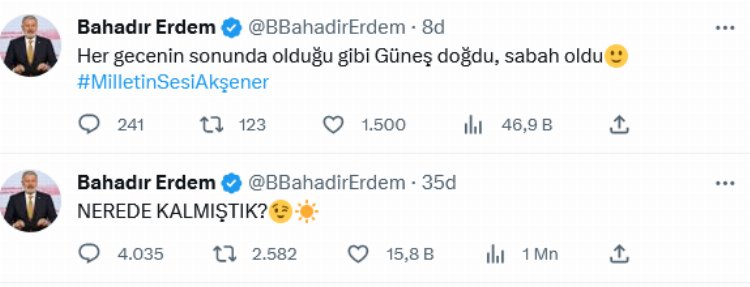 ANKARA (İGFA) - İstanbul Büyükşehir Belediye Başkanı Ekrem İmamoğlu ile Ankara Büyükşehir Belediye Başkanı Mansur Yavaş'ın, İYİ Parti Genel Başkanı Meral Akşener ile görüşmesi sonrasında İYİ Parti Genel Başkan Yardımcısı Bahadır Erdem ile CHP İstanbul Milletvekili Gürsel Tekin sosyal medya hesaplarından yaptığı paylaşım dikkati çekti.