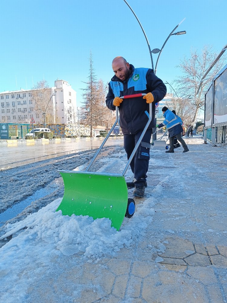 Günün ilk ışıklarıyla beraber Büyükşehir Belediyesi Kent Estetiği ve Yeşil Alanlar Daire Başkanlığı, görevlendirdiği 5 JCB, 22 araç ve 450 personelle şehir merkezinde vatandaşların olumsuzluk yaşamaması için kaldırımların kar ve buz temizliğini aralıksız sürdürüyor.
