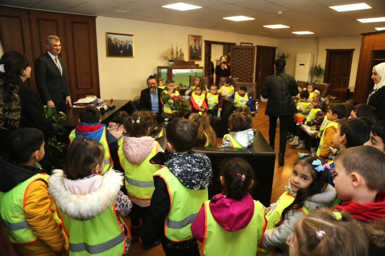 Kocaeli'de Gölcük Belediye Başkanı Ali Yıldırım Sezer, Demokrasi ve İnsan Hakları Haftası kapsamında Düzağaç Anaokulu öğrencilerini makamında misafir etti.