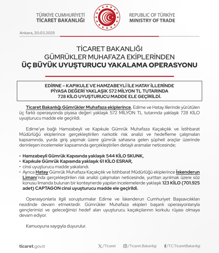 Ticaret Bakanlığı Gümrükler Muhafaza ekiplerince, Edirne ve Hatay'da yürütülen üç farklı operasyonda piyasa değeri yaklaşık 572 milyon TL tutarında olan yaklaşık 728 kilo uyuşturucu madde ele geçirildi.