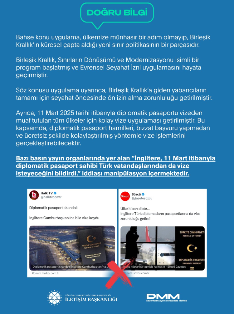 ANKARA (İGFA) - İngiltere’nin, diplomatik pasaport sahibi Türk vatandaşlarından vize isteyeceği iddiasına ilişkin açıklama İletişim Başkanlığı'ndan geldi.