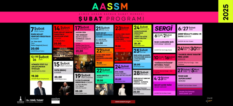 İzmir Büyükşehir Belediyesi Ahmed Adnan Saygun Sanat Merkezi (AASSM) şubat ayını birbirinden farklı etkinliklerle karşılıyor. Bu yıl 28 gün sürecek şubat, adeta sanatla uzayacak; ay boyunca çok sayıda konser, sergi, yarışma ve atölye İzmirlilere unutulmaz anlar yaşatacak. 14 Şubat Sevgililer Günü’nde ise İzmir Devlet Senfoni Orkestrası özel bir konser düzenleyecek.