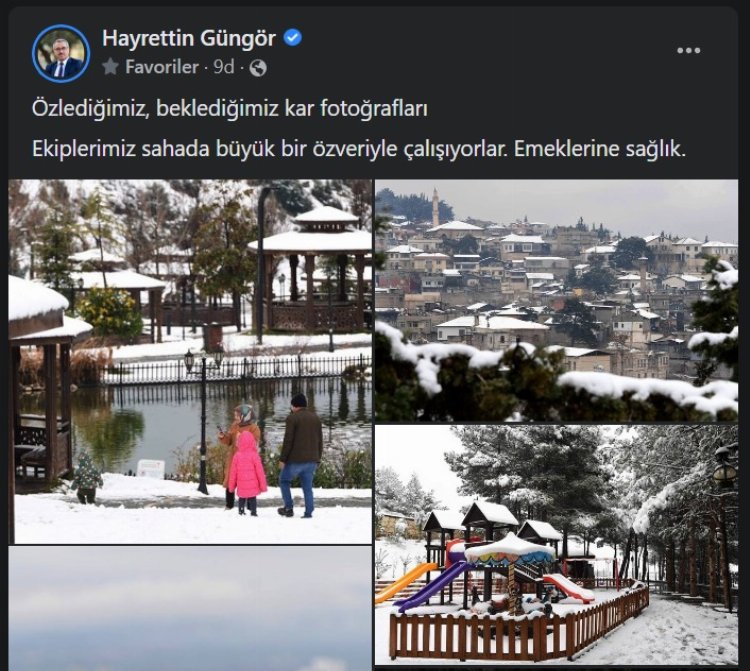 "Özlediğimiz, beklediğimiz kar fotoğrafları" başlığıyla karlı Kahramanmaraş fotoğraflarına yer veren Başkan Güngör paylaşımında, “Ekiplerimiz sahada büyük bir özveriyle çalışıyorlar. Emeklerine sağlık” ifadelerini kullandı.
