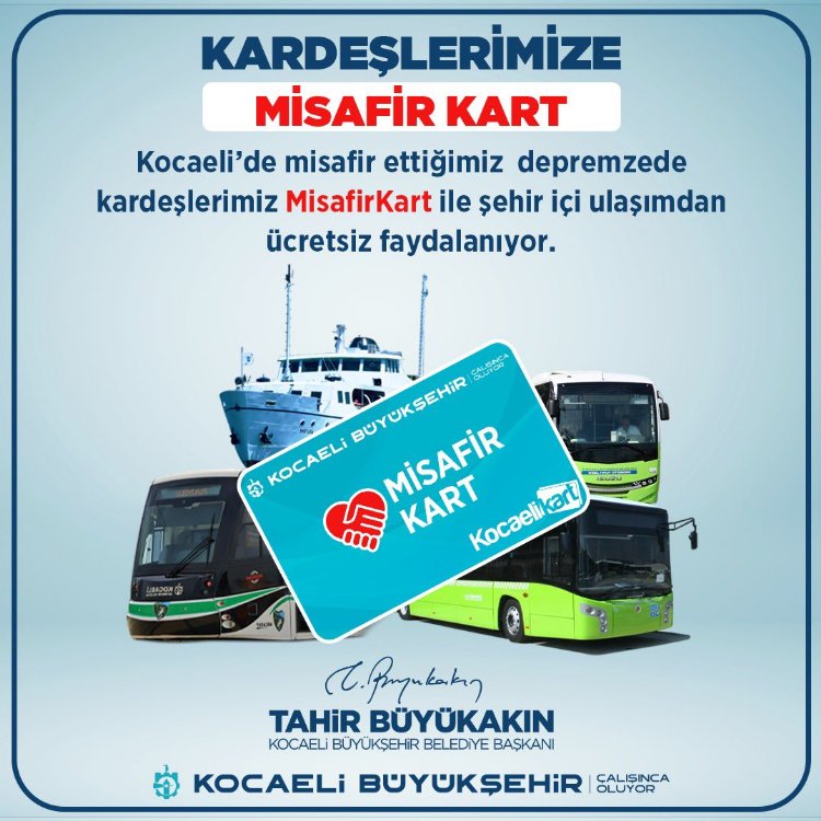 Kocaeli Büyükşehir Belediyesince devreye alınan ‘Misafir Kart’ ile depremzede vatandaşların, il genelindeki özel halk otobüsü ve belediyeye ait tüm toplu taşıma araçlarından ücretsiz yararlanması sağlanıyor.