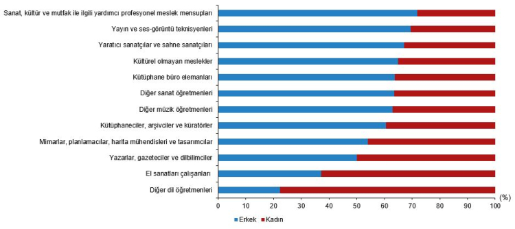 Meslek grubu dağılımında el sanatları çalışanları yüzde 32,6 ile birinci sırada yer alırken, kadın istihdamının en yüksek olduğu alan diğer dil öğretmenleri (yüzde 77,7) oldu. En düşük olduğu alan ise sanat, kültür ve mutfakla ilgili yardımcı meslekler (yüzde 28,2) oldu.