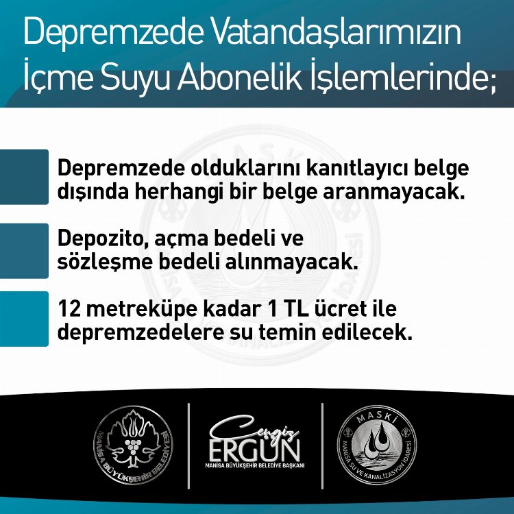 Manisa Su ve Kanalizasyon İdaresi (MASKİ) Genel Müdürlüğünün, 2023 yılı 1. Olağanüstü Genel Kurulunda deprem bölgesinden ayrılarak Manisa’ya yerleşen depremzedelerden, depozito, açma bedeli ve sözleşme bedelinde ücret talep etmemesi ve 12 metreküpe kadar su kullanımda da temsili olarak 1 TL ücret alması kararlaştırıldı.