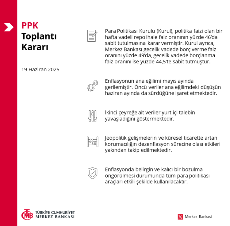 Türkiye Cumhuriyet Merkez Bankası (TCMB), 19 Haziran 2025 tarihli Para Politikası Kurulu (PPK) toplantısında, bir hafta vadeli repo ihale faiz oranını %46’da sabit tuttu. Gecelik borç verme faizi yüzde 49, borçlanma faizi ise yüzde 44,5 seviyesinde değişmedi.