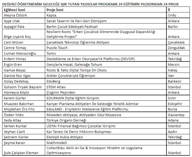 Anadolu Vakfı Eğitimin Yıldızları olarak kabul edilen 24 projenin, ‘’Yıldız Projeler’’ olarak tüm Türkiye’ye tanıtılacak, mentorluk, networking, kırkar bin TL maddi destek ve iş birliği imkanları ile projelerin hayata geçirilmesi destekleneceği bildirildi.