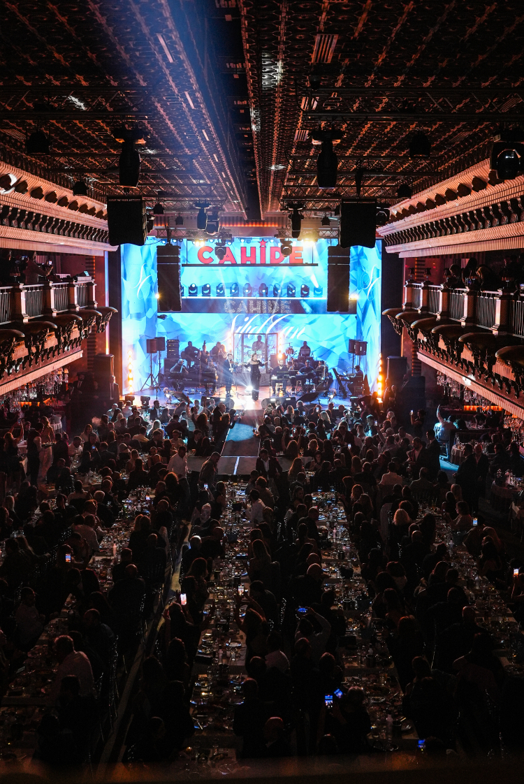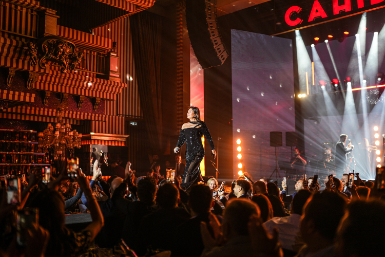 Sibel Can, sahneye Amor Gariboviç imzalı, siyah tamamen taşlarla süslü özel tasarımıyla çıktı. Işıltılı görünümü ve sahne enerjisiyle göz kamaştıran sanatçı, güçlü yorumuyla bir kez daha geceye damgasını vurdu.