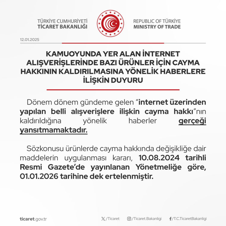 Açıklamada, söz konusu ürünlerde cayma hakkında değişikliğe dair maddelerin uygulanması kararı 10 Ağustos 2024 tarihli Resmi Gazete'de yayımlanan yönetmeliğe göre 1 Ocak 2026 tarihine dek ertelendiğinin altı çizildi.