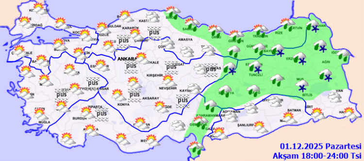 ANKARA (İGFA) - Meteoroloji Genel Müdürlüğü, 01 Aralık Pazartesi gününe ilişkin hava tahmin raporunu yayımladı. Yapılan son tahminlere göre, yurt genelinin parçalı ve çok bulutlu, Marmara'nın doğusu, Kuzey Ege, İç Anadolu (Karaman ve Niğde hariç), Karadeniz, Doğu Anadolu, Kahramanmaraş, Osmaniye, Hatay ve Siirt çevreleri ile Adana'nın doğu, Aydın'ın kıyı kesimlerinin yağışlı geçeceği tahmin ediliyor.