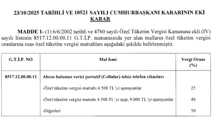 Ayrıca 8517.12.00.00.11 GTİP numaralı malların (cep telefonları) ÖTV matrahları yeniden tespit edildi. Matrahlar, vergi hesaplamasını güncel piyasa koşullarına uyarlayacak şekilde revize edildi.