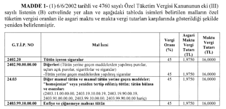 Tütün ürünlerinde yüzde 45’lik ÖTV oranı korunurken, asgari maktu ve maktu tutarlar artırıldı. Bu değişiklikler, tütün mamullerinin satış fiyatlarına zam olarak yansıyacak.