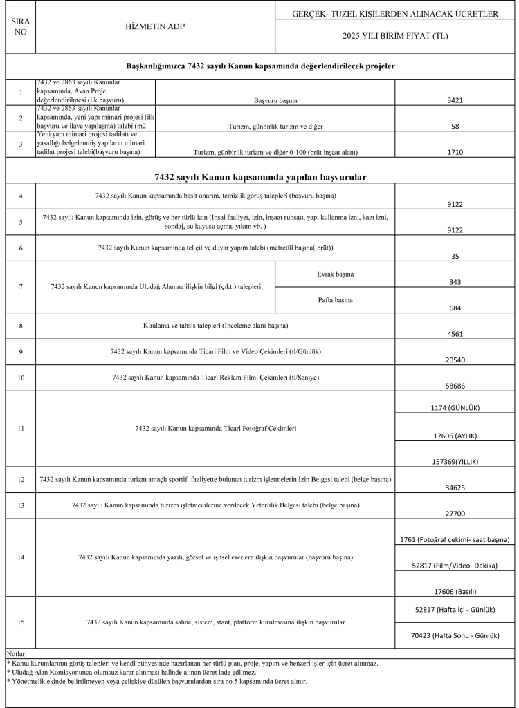 Uludağ Alan Başkanlığı, Uludağ'da 7432 Sayılı Kanun kapsamında yapılan başvurular ile değerlendirilecek proje hizmetlerinin 2025 yılı tarifelerinde güncelleme yaptı.