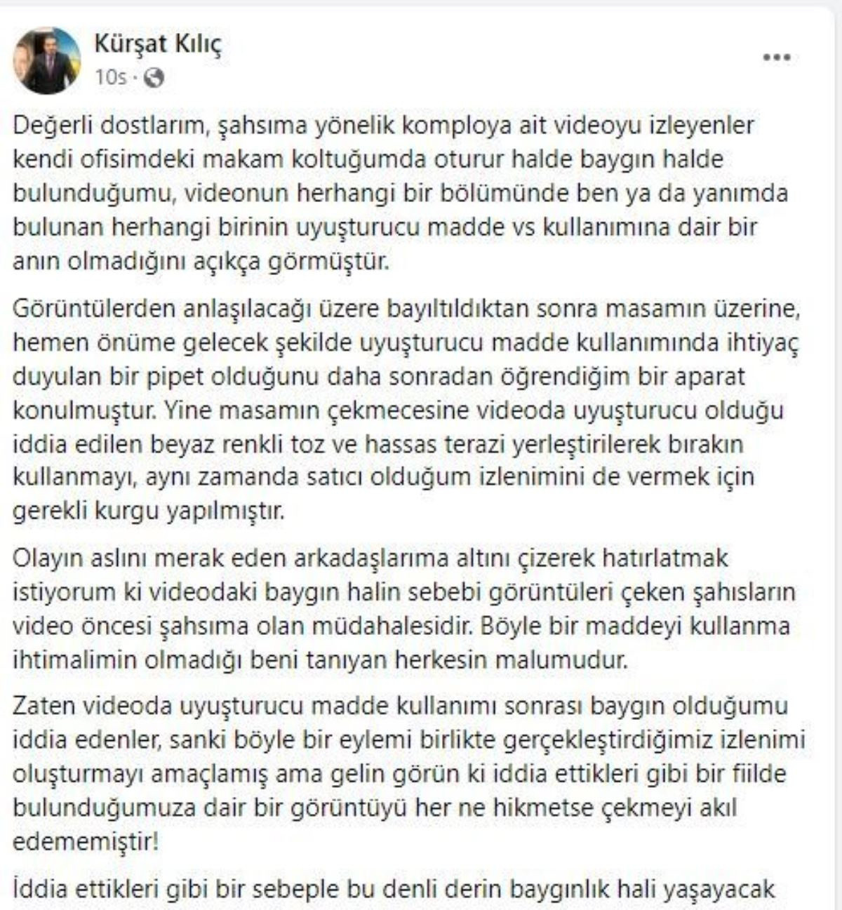 “Değerli dostlarım, şahsıma yönelik komploya ait videoyu izleyenler kendi ofisimdeki makam koltuğumda oturur halde baygın halde bulunduğumu, videonun herhangi bir bölümünde ben ya da yanımda bulunan herhangi birinin uyuşturucu madde vs kullanımına dair bir anın olmadığını açıkça görmüştür. Görüntülerden anlaşılacağı üzere bayıltıldıktan sonra masamın üzerine, hemen önüme gelecek şekilde uyuşturucu madde kullanımında ihtiyaç duyulan bir pipet olduğunu daha sonradan öğrendiğim bir aparat konulmuştur. Yine masamın çekmecesine videoda uyuşturucu olduğu iddia edilen beyaz renkli toz ve hassas terazi yerleştirilerek bırakın kullanmayı, aynı zamanda satıcı olduğum izlenimini de vermek için gerekli kurgu yapılmıştır”