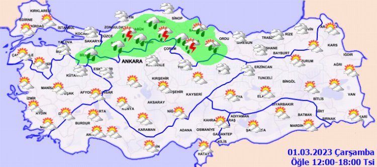 Ülkenin kuzey kesimlerinin parçalı ve çok bulutlu, Marmara'nın doğusu, Karadeniz ile Ankara, Çankırı ve Ardahan çevrelerinin sağanak ve gök gürültülü sağanak yağışlı, diğer yerlerin az bulutlu geçeceği tahmin ediliyor.