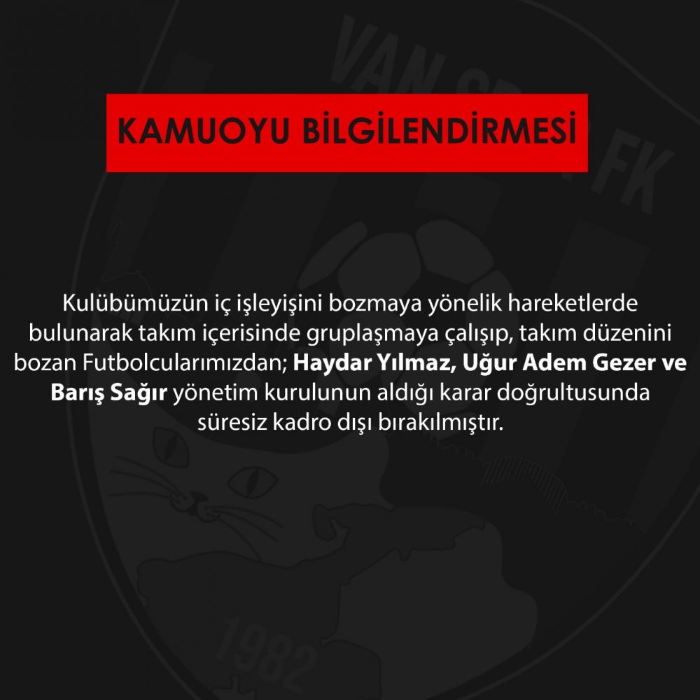 Vanspor, sosyal medya hesabından yaptığı açıklamada, " Kulübümüzün iç işleyişini bozmaya yönelik hareketlerde bulunarak takım içerisinde gruplaşmaya çalışıp, takım düzenini bozan Futbolcularımızdan; Haydar Yılmaz, Uğur Adem Gezer ve Barış Sağır yönetim kurulunun aldığı karar doğrultusunda  süresiz kadro dışı bırakılmıştır" ifadelerine yer verildi.